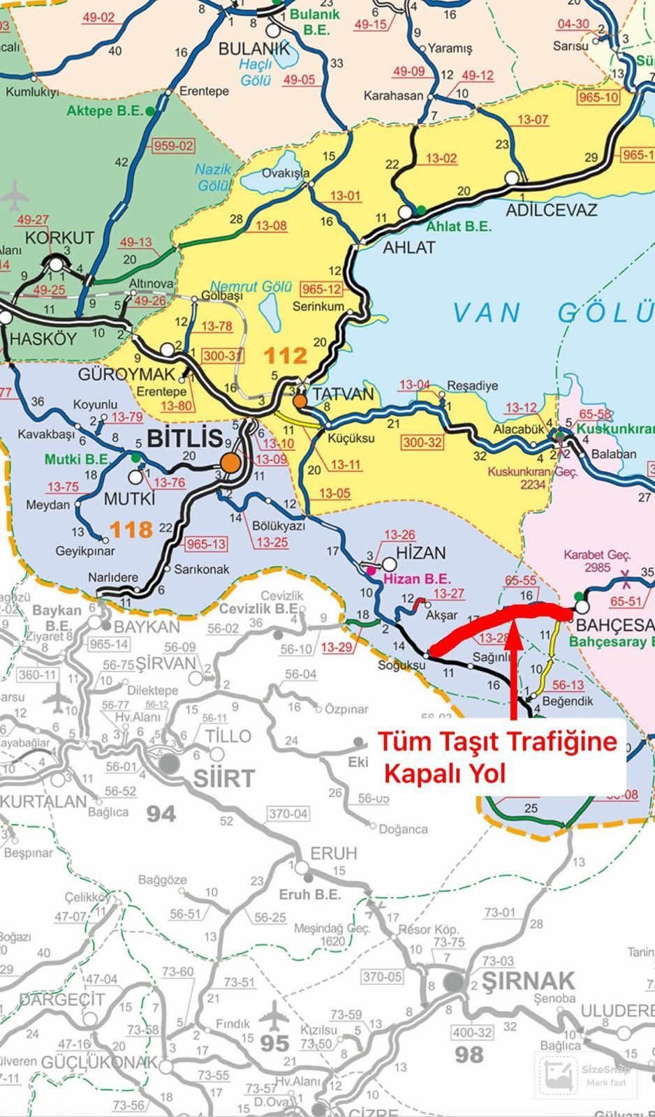 Yetkililerden yapılan açıklamaya göre, 13-28 KK nolu Hizan–Kalkanlı yolu ile 65-55 KK nolu Kalkanlı–Bahçesaray yolu, meydana gelen çığ düşmesi ve bölgede çığ riskinin devam etmesi sebebiyle çift yönlü olarak trafiğe kapatıldı.